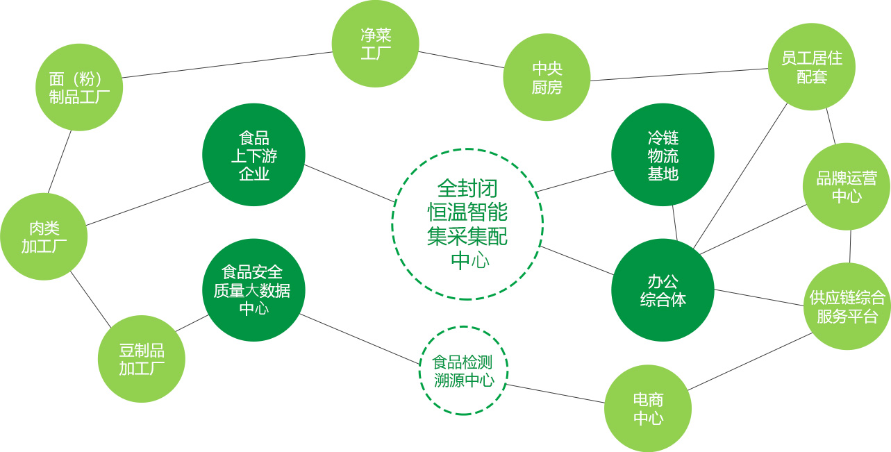 樂禾食品科技產業園定位為建立一個由政府、消費端、企業三方監管的從農田到餐桌的食安保障基地,服務當地學校、機關事業單位、部隊、企業等單位以及居民菜籃子,徹底解決食品安全問題;并以食材配送帶動當地一產、二產、三產融合。